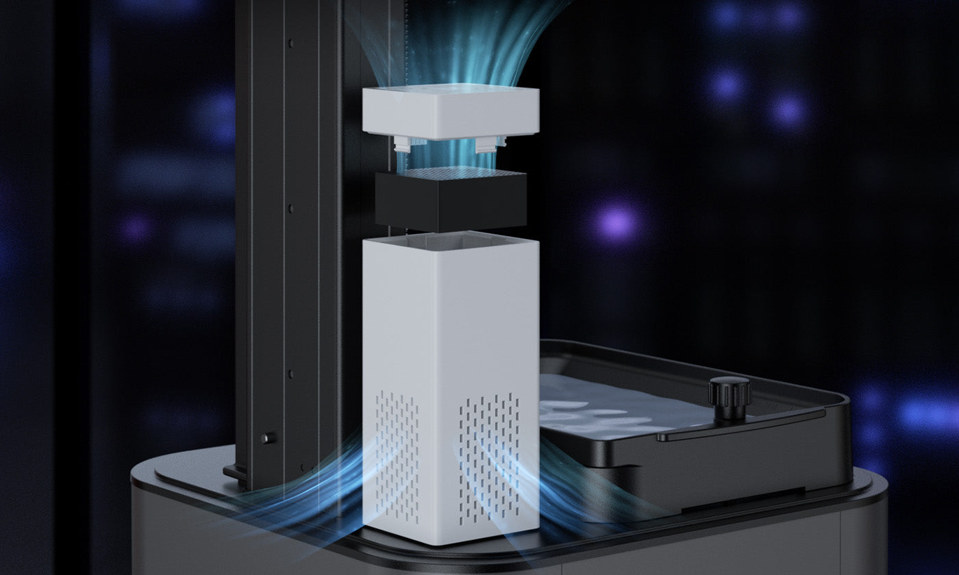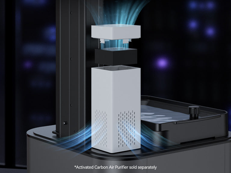 The 18 mm high-density activated carbon filter, weighing 17 grams, is designed to efficiently capture and neutralize odor molecules produced during printing.