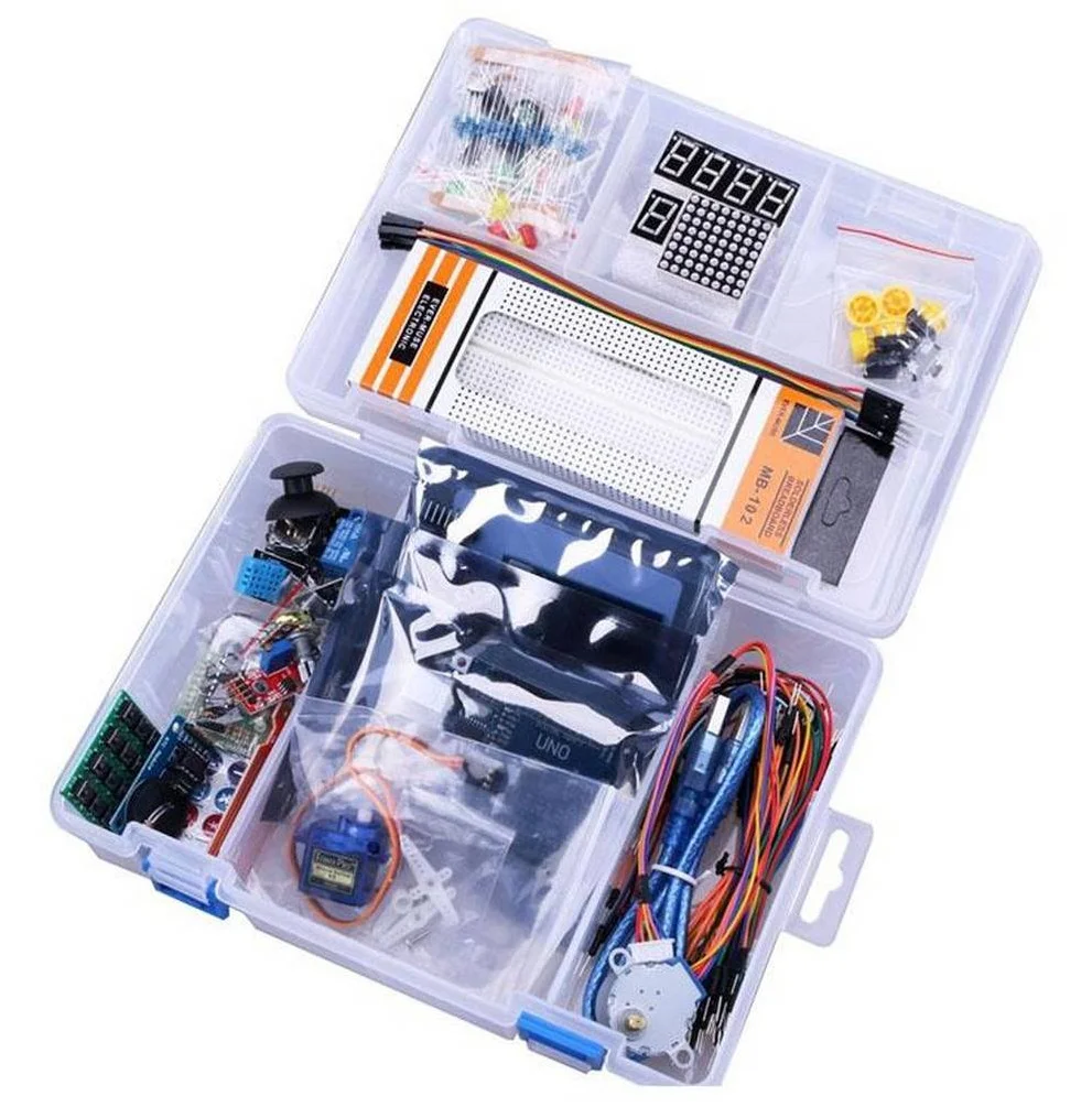The Arduino Starter Kit is a comprehensive, beginner-friendly bundle designed to teach the fundamentals of electronics, coding, and prototyping through hands-on projects. It typically includes an Arduino Uno board, jumper wires, a breadboard, and various sensors/actuators (LEDs, motors, sensors…)….