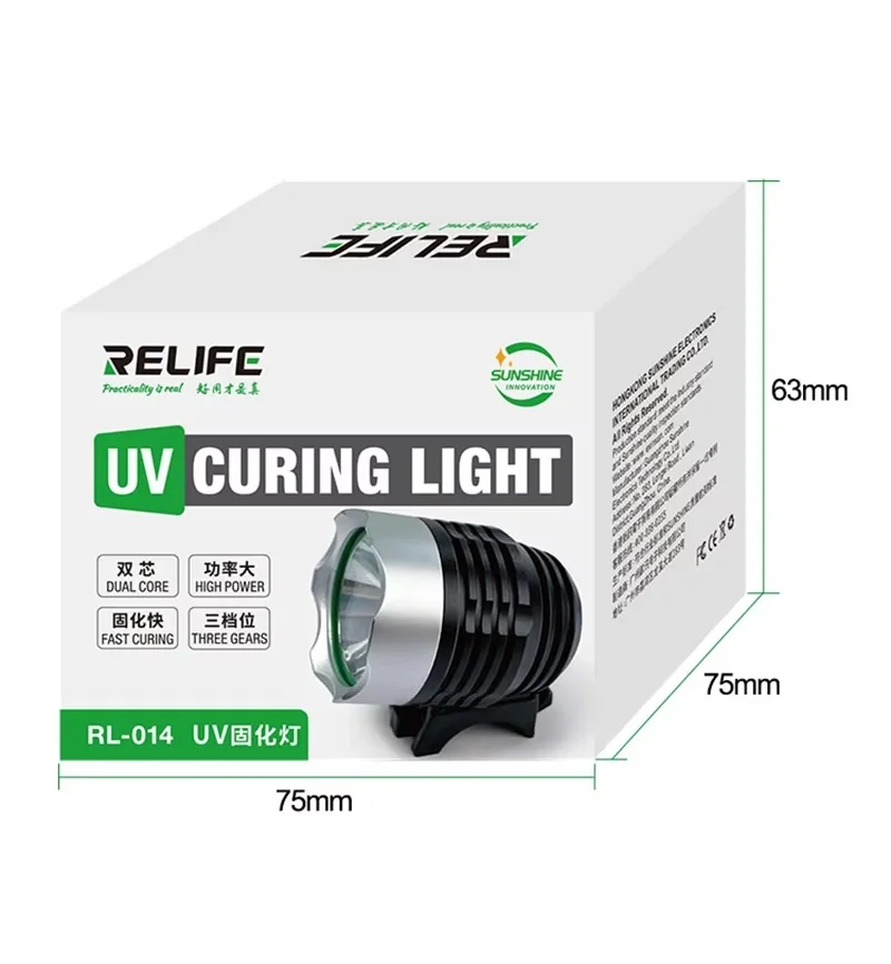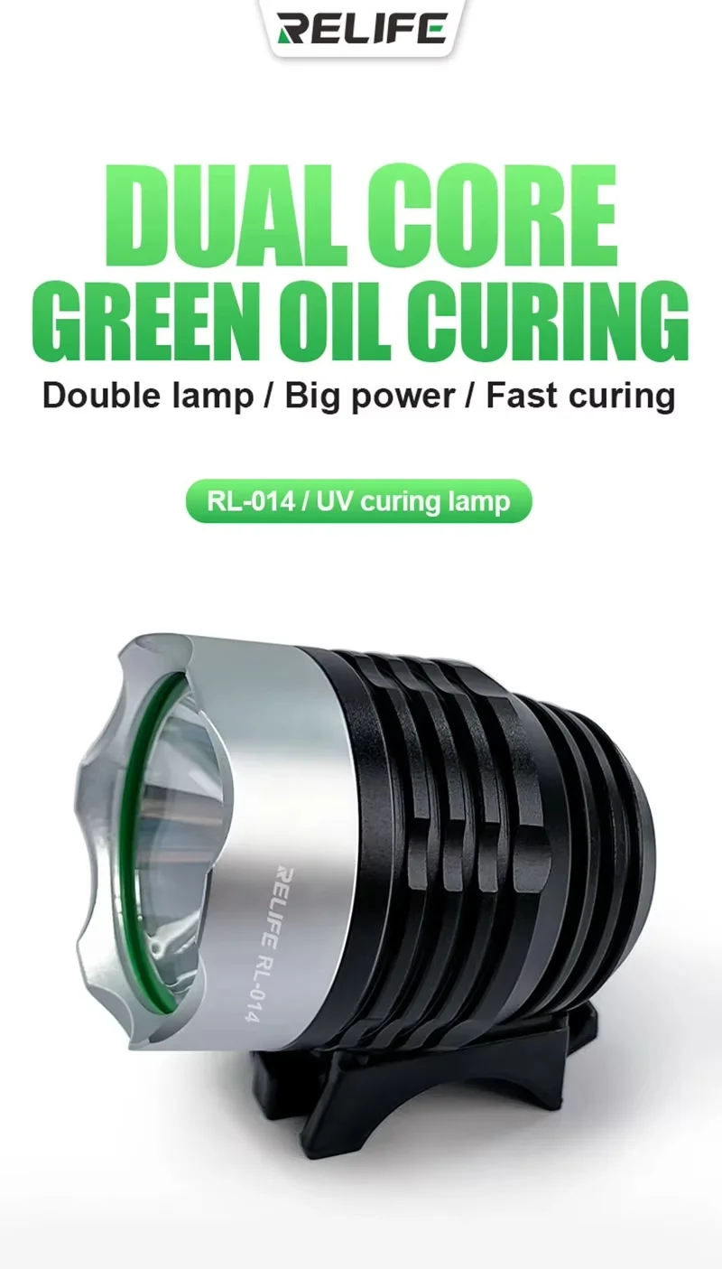 The RL-014 UV curing lamp is a compact and powerful lamp designed for rapid curing of adhesives and photosensitive materials used in mobile phone repair and other technical applications. It is ideal for UV adhesives, photosensitive green oil, optical adhesives, shadow-free adhesives and resins requiring UV light to cure effectively.