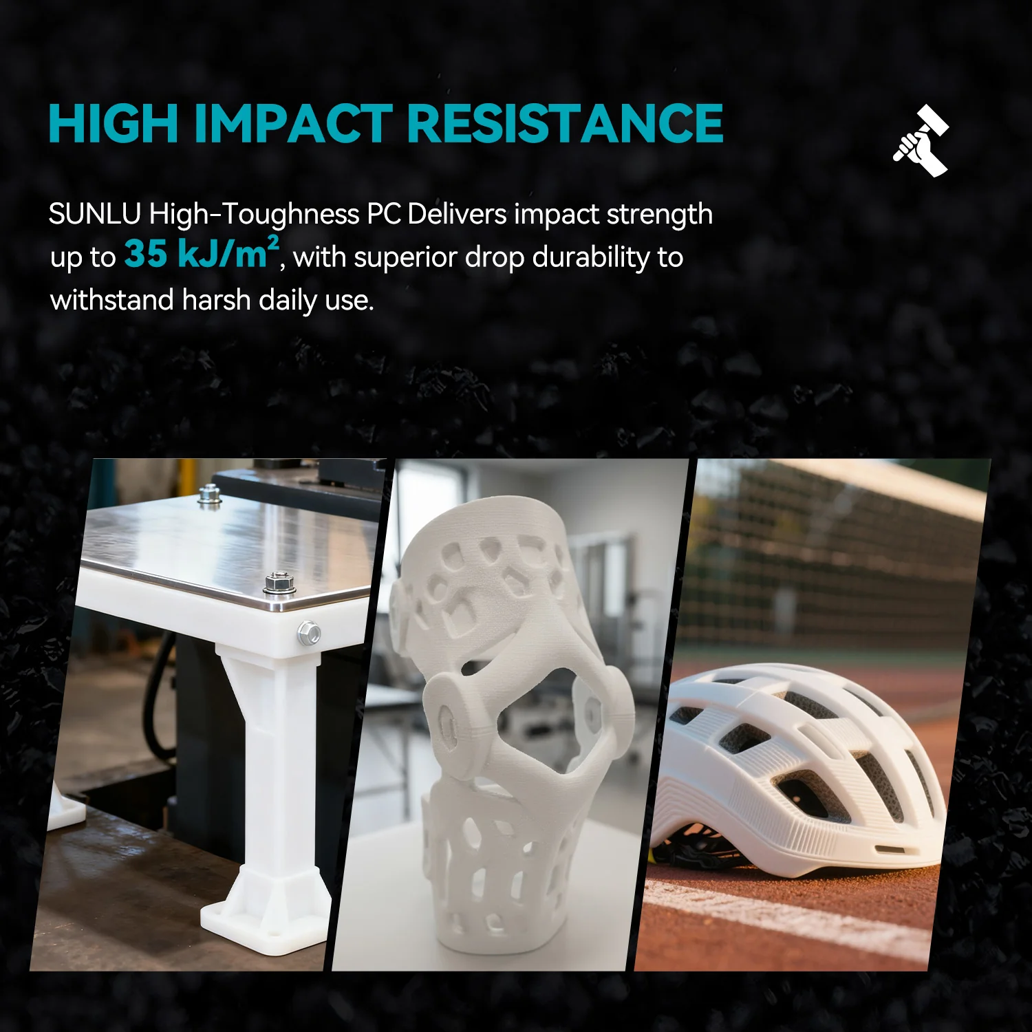 PC filament delivers exceptional toughness and high impact resistance (up to 35 kJ/m²), combined with reliable heat resistance up to 94 °C, making it ideal for demanding functional and industrial applications. Designed for stable high-temperature printing at 260–280 °C, it offers strong layer adhesion, minimal warping, and excellent dimensional stability when used in an enclosed chamber. With its ability to withstand drops, heat, and long-term mechanical stress, SUNLU PC is a dependable choice for durable tools, outdoor parts, and high-performance components.